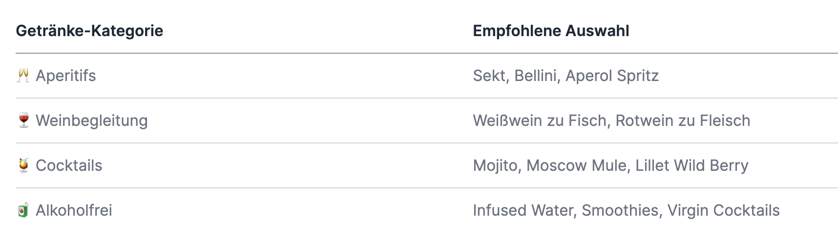 ✅ Lösung: Passende Weine, Cocktails & alkoholfreie Alternativen einplanen